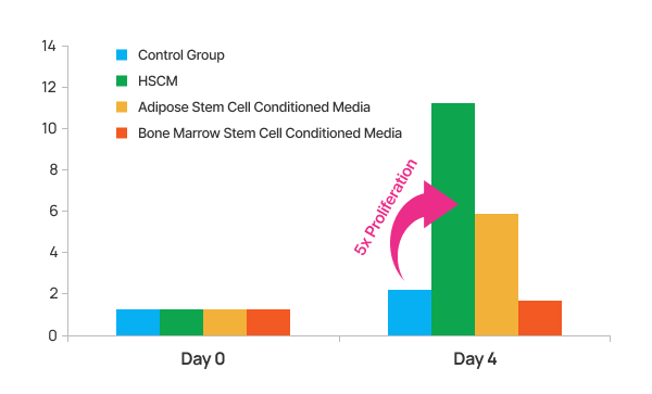 Dermal cells were cultured for four days in HSCM (Human Cord Blood Stem Cell Conditioned Media), adipose stem cell conditioned media, and bone marrow stem cell conditioned media, respectively. The results showed that bone marrow stem cell conditioned media led to a decrease in dermal cell proliferation compared to the control group, while adipose stem cell conditioned media resulted in approximately twice the proliferation. In contrast, HSCM demonstrated more than a fivefold increase in proliferation compared to the control group.