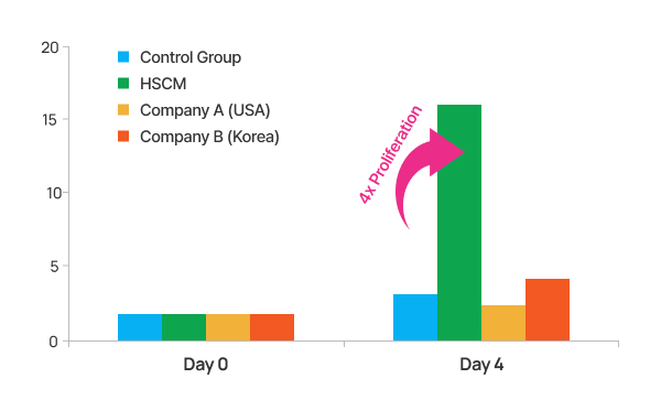 After culturing dermal cells for four days with stem cell conditioned media from various companies, Company A (USA) showed no dermal cell proliferation, while Company B (Korea) demonstrated proliferation similar to the control group. In contrast, HSCM resulted in a significant increase in proliferation, showing over four times the growth compared to the control group.