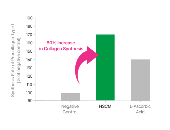 When Vitamin C (L-ascorbic acid), known for its superior ability to synthesize collagen, was supplied to skin dermal cells, collagen synthesis increased by 40% compared to the control group. However, when HSCM was supplied, collagen synthesis was confirmed to be over 60%, which is 20% higher than with Vitamin C.