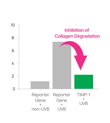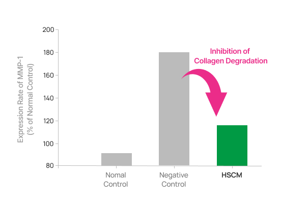 When dermal cells were exposed to UV radiation, MMP-1 levels increased by over 80% compared to the non-irradiated control group. However, when dermal cells were exposed to UV radiation in the presence of HSCM, the synthesis of MMP-1 was significantly reduced to 20%. This suppression of MMP-1 helps inhibit collagen breakdown in dermal cells, thereby maintaining collagen levels in the skin.