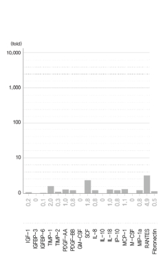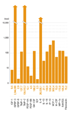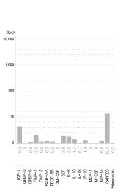 위 그래프는 휴코드의 HSCM내에 존재하는 성장인자와 사이토카인이 다른 회사의 배양액보다 만 배에서 7만 배 높음을 보여줍니다.