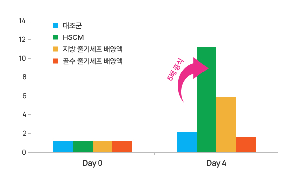 진피세포를 HSCM (제대혈 줄기세포 배양액), 지방 줄기세포 배양액, 골수 줄기세포 배양액에 각각 4일 동안 키운 다음 진피세포의 증식을 확인한 결과, 골수 줄기세포 배양액은 대조군에 비해 증식이 오히려 줄어들었고, 지방 줄기세포 배양액은 약 2배 정도 증식한 반면, HSCM은 대조군에 비해 5배 이상의 높은 증식을 보였습니다.