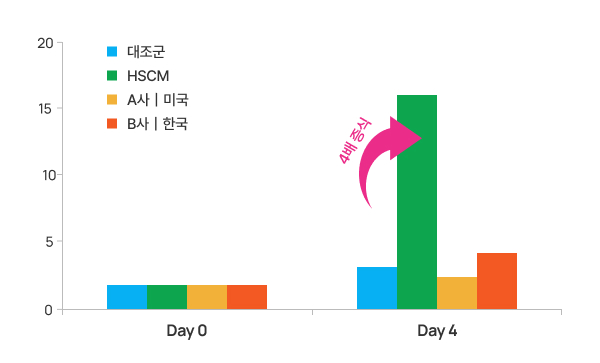 각 회사의 줄기세포 배양액으로 진피세포를 4일 동안 키운 결과 A사 (미국)는 진피세포증식이 전혀 나타나지 않았고 B사 (한국)의 경우에는 대조군과 유사한 증식능력을 보인 반면, HSCM은 대조군에 비해 4배 이상의 현저한 증식을 나타냈습니다.