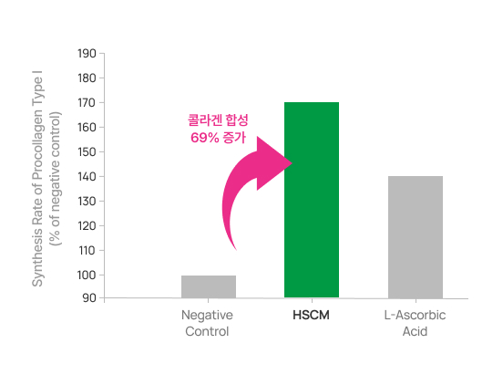 Collagen의 합성 능력이 가장 뛰어나다고 알려진 비타민C (L-ascorbic acid)를 피부 진피 세포에 공급한 경우 대조군보다 collagen 합성이 40% 증가한 반면 HSCM을 공급하였을 때에는 비타민C 보다 20% 더 높은 60% 이상의 콜라겐 합성을 확인하였습니다.