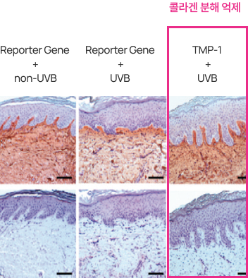 TIMP-1을 주입한 경우 상피-진피의 접합부와 혈관을 따라 콜라겐 IV가 풍부하게 연속성을 유지한 반면, 대조군에서는 상당량의 콜라겐이 감소하고 연속성이 손실되었습니다